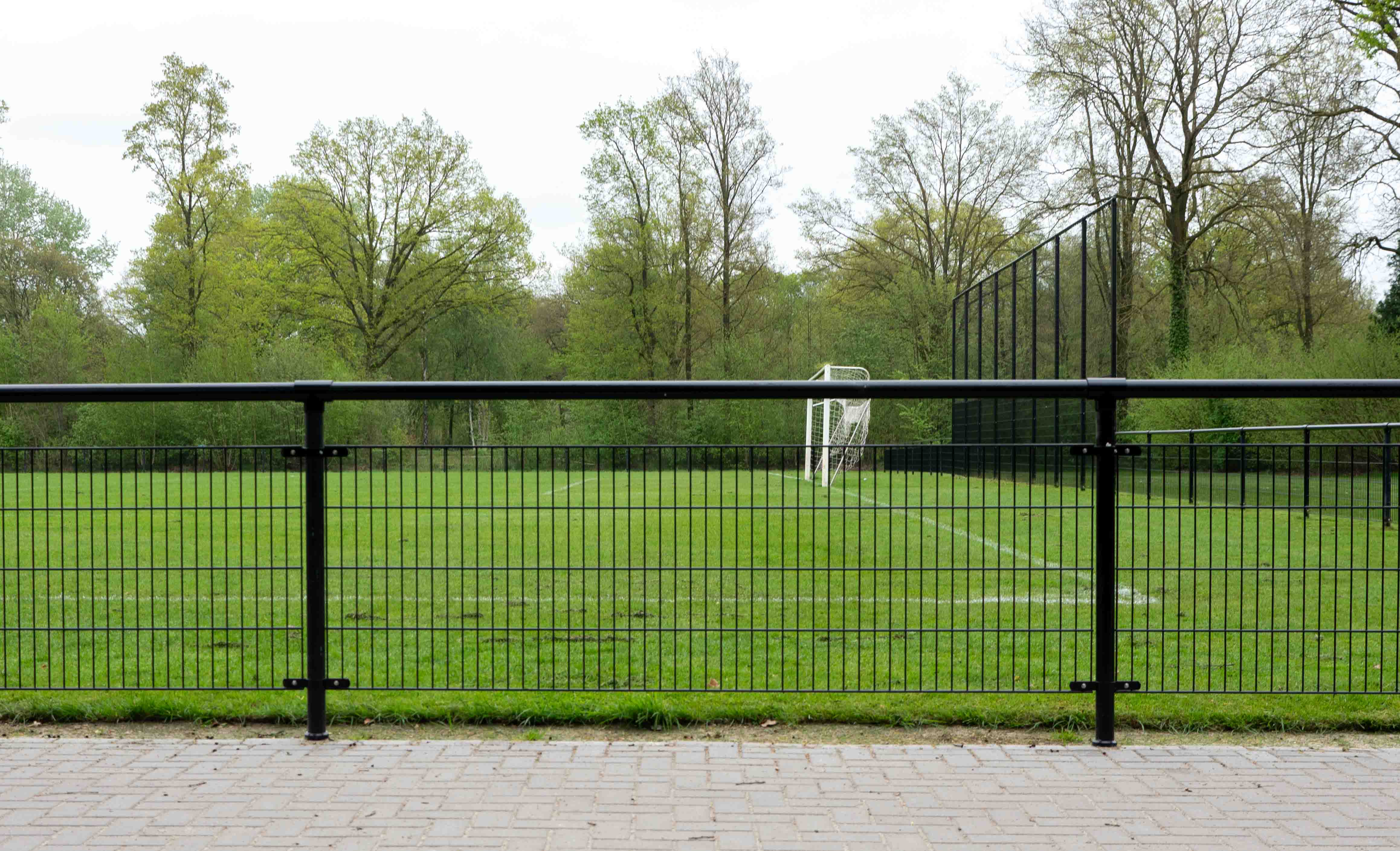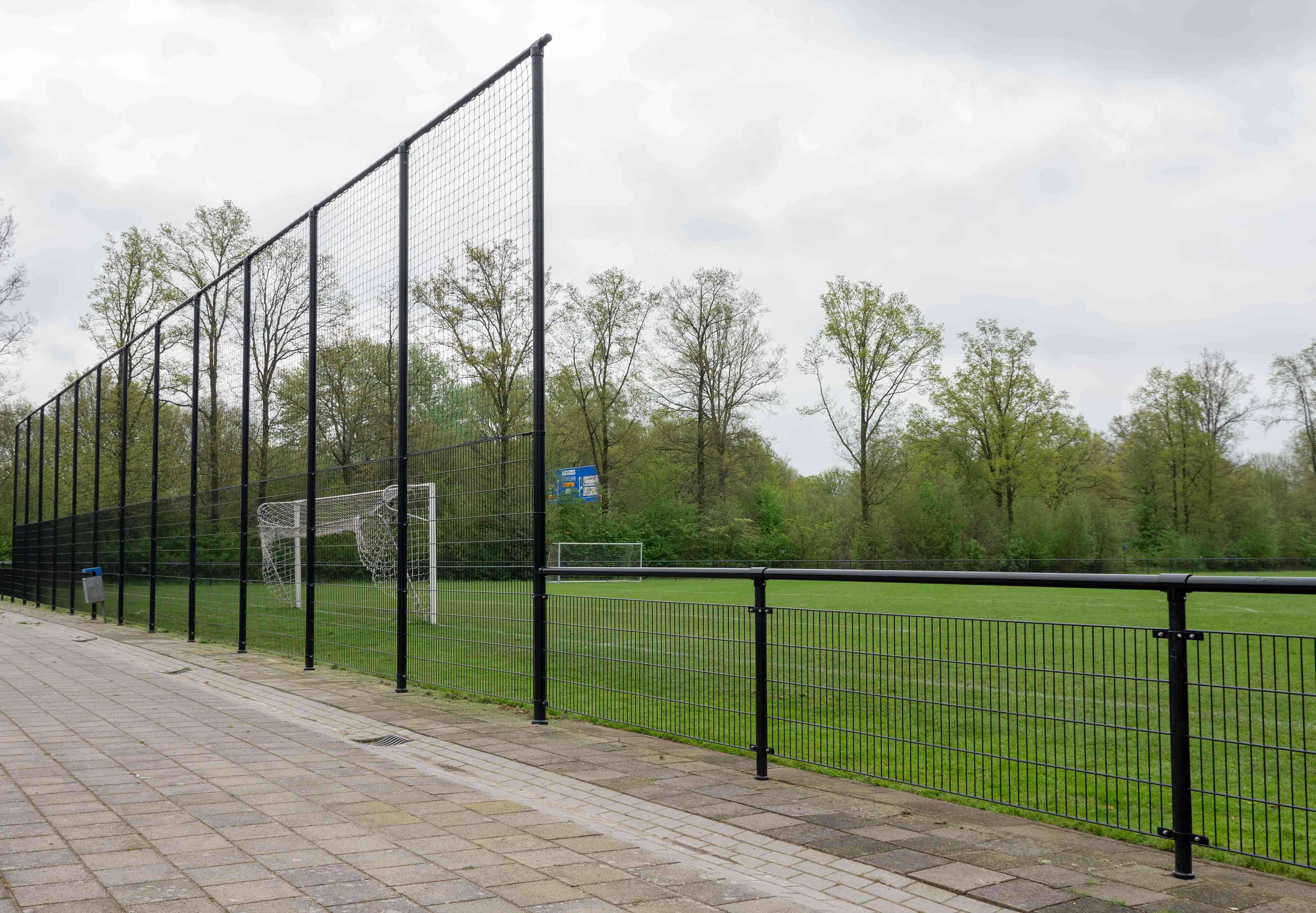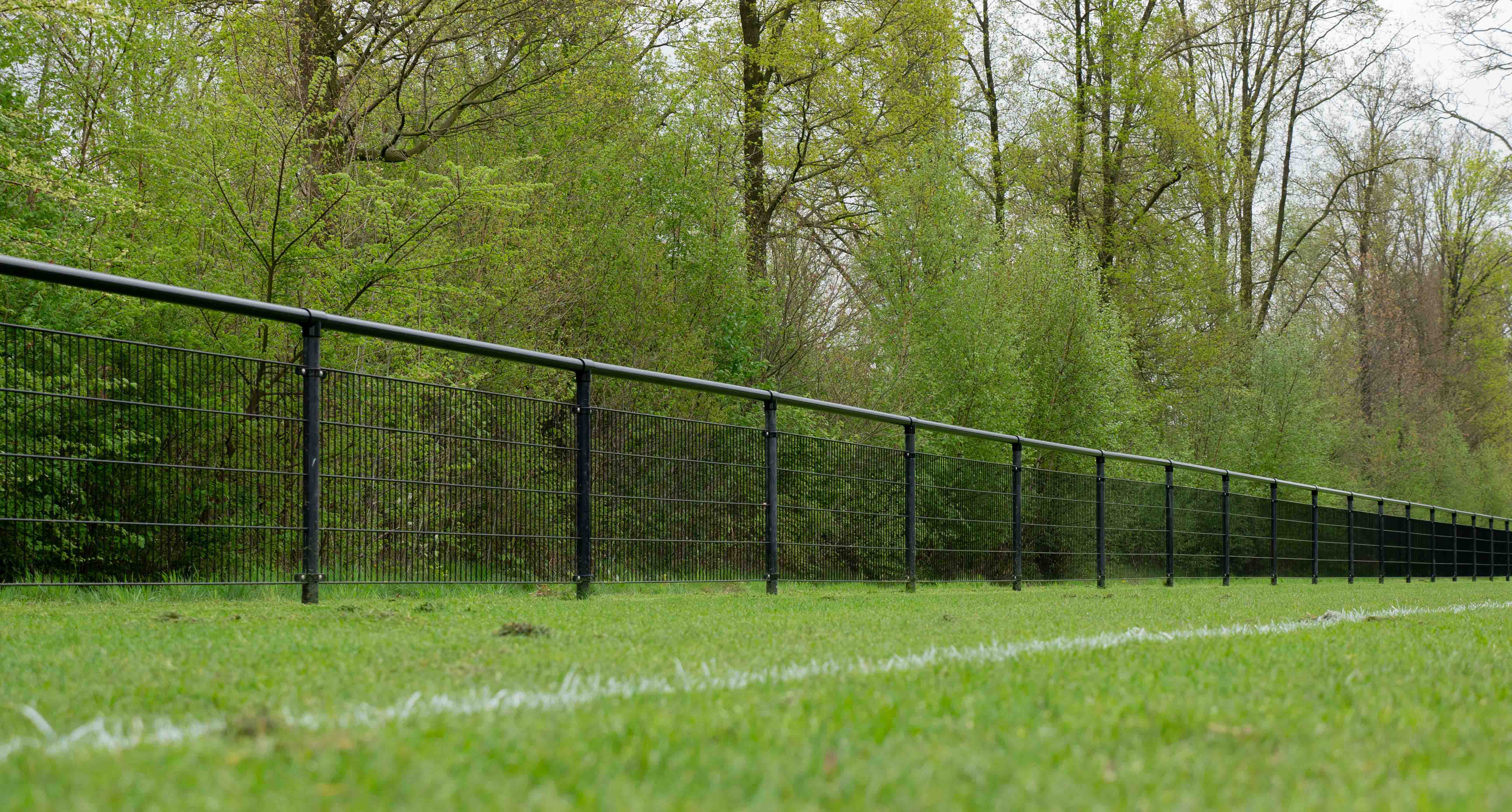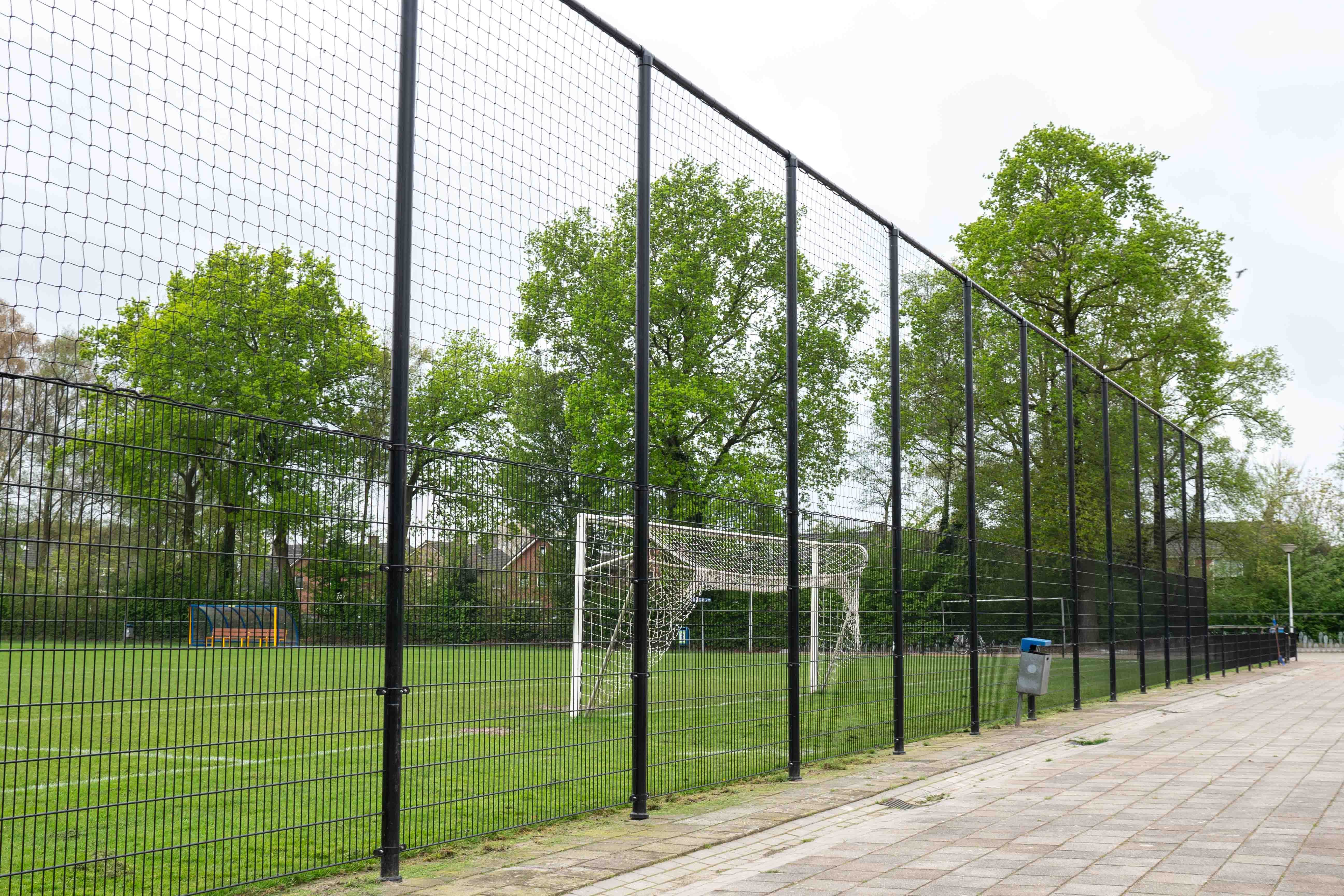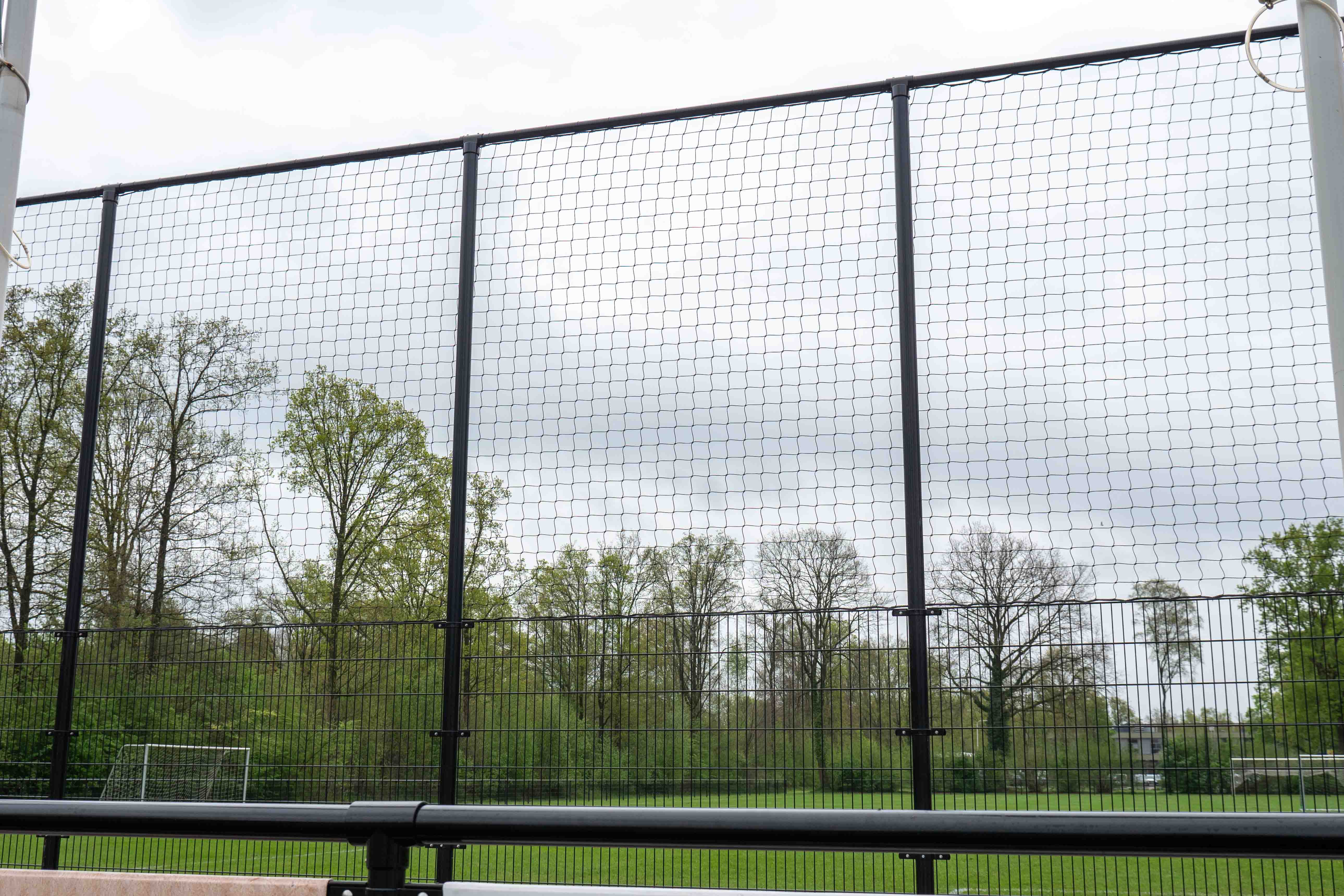 Naast het leunhekwerk zijn aan beide kanten van het veld ballenvangers van 5 meter hoog geïnstalleerd. De ballenvangers bestaan uit dubbelstaafmatten met ronde staanders van 89x2,5mm en horizontale palen van 60mm. De ballenvangers zijn voorzien van een zwart PE-net.